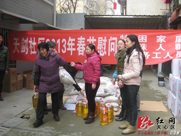 1月26日,金盆岭街道天剑社区工作人员向社区内的特困家庭、特殊人群、生活困难的外来务工人员、社区清扫员发放生活慰问品。慰问品是由社区通过各种渠道筹集,由省红十字会所提供的物质。
