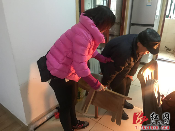 社区网格员搀扶行动不便的黄嗲嗲落座。