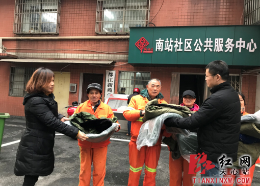 环卫工人常常被人们赞誉为“城市的美容师”, 新一轮低温雨雪冰冻天气即将来临,但环卫工人仍然坚持在一线认真工作,他们兢兢业业、默默无闻地把城市装扮得整洁美丽。南站社区很是牵挂环卫工人的身体冷暖。