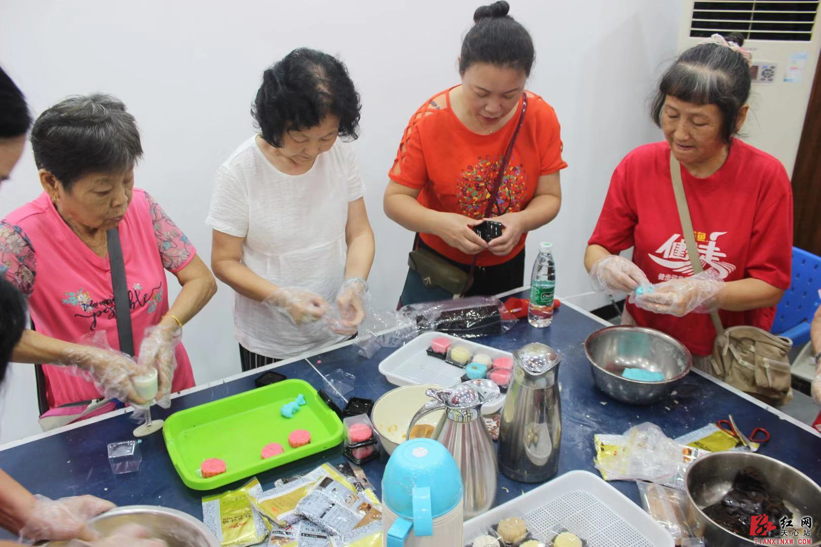 9月12日上午8点,金盆岭街道夏家冲社区党群服务中心内人头攒动,党员、群众三五成群围在一起,分工协作,搅拌糯米粉、揉团、擀皮、包馅、压膜……很快,一个个高颜值的冰皮月饼就做好了。
